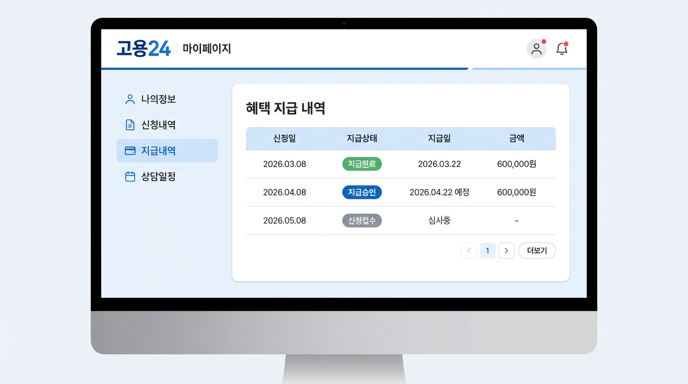 [이미지: 고용24 마이페이지 지급내역 조회 화면 캡처]
