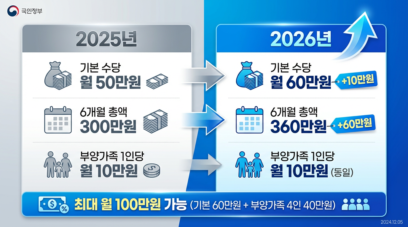 2026년부터 1유형 구직촉진수당이 월 50만 원 → 60만 원으로 인상되었습니다.