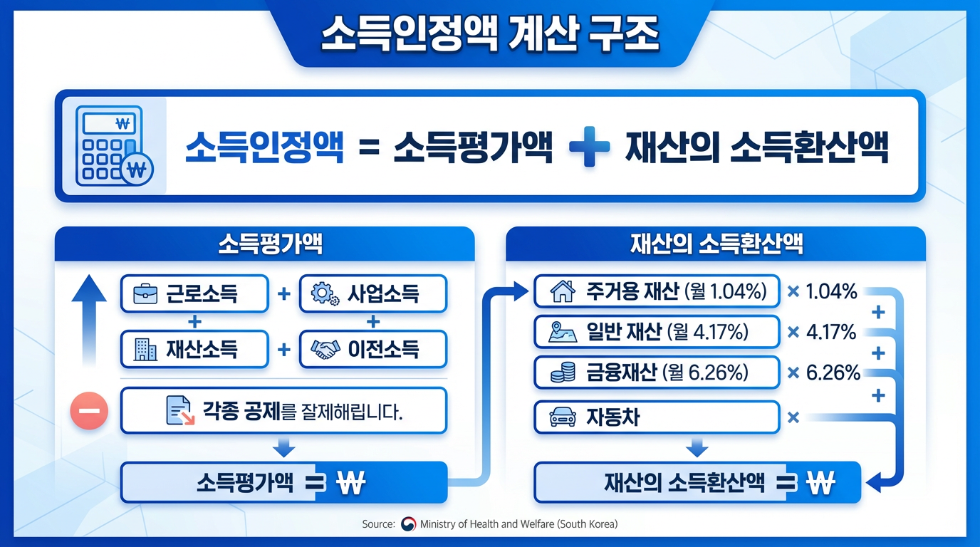 - 재산: 주거용 재산, 일반 재산, 금융 재산, 자동차 등을 모두 소득환산액으로 계산합니다.