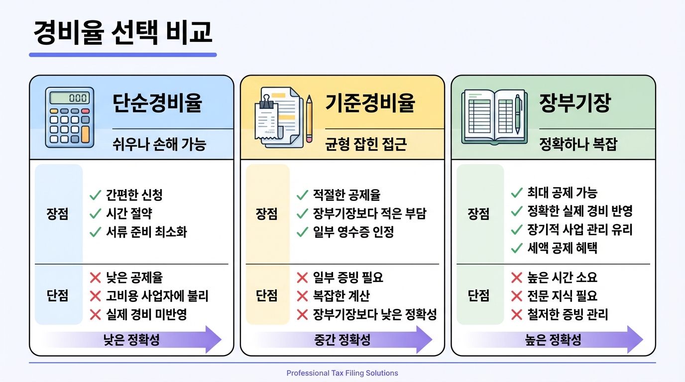 - 기준경비율: 주요 경비만 증빙하면 되지만 세금이 많을 수 있음