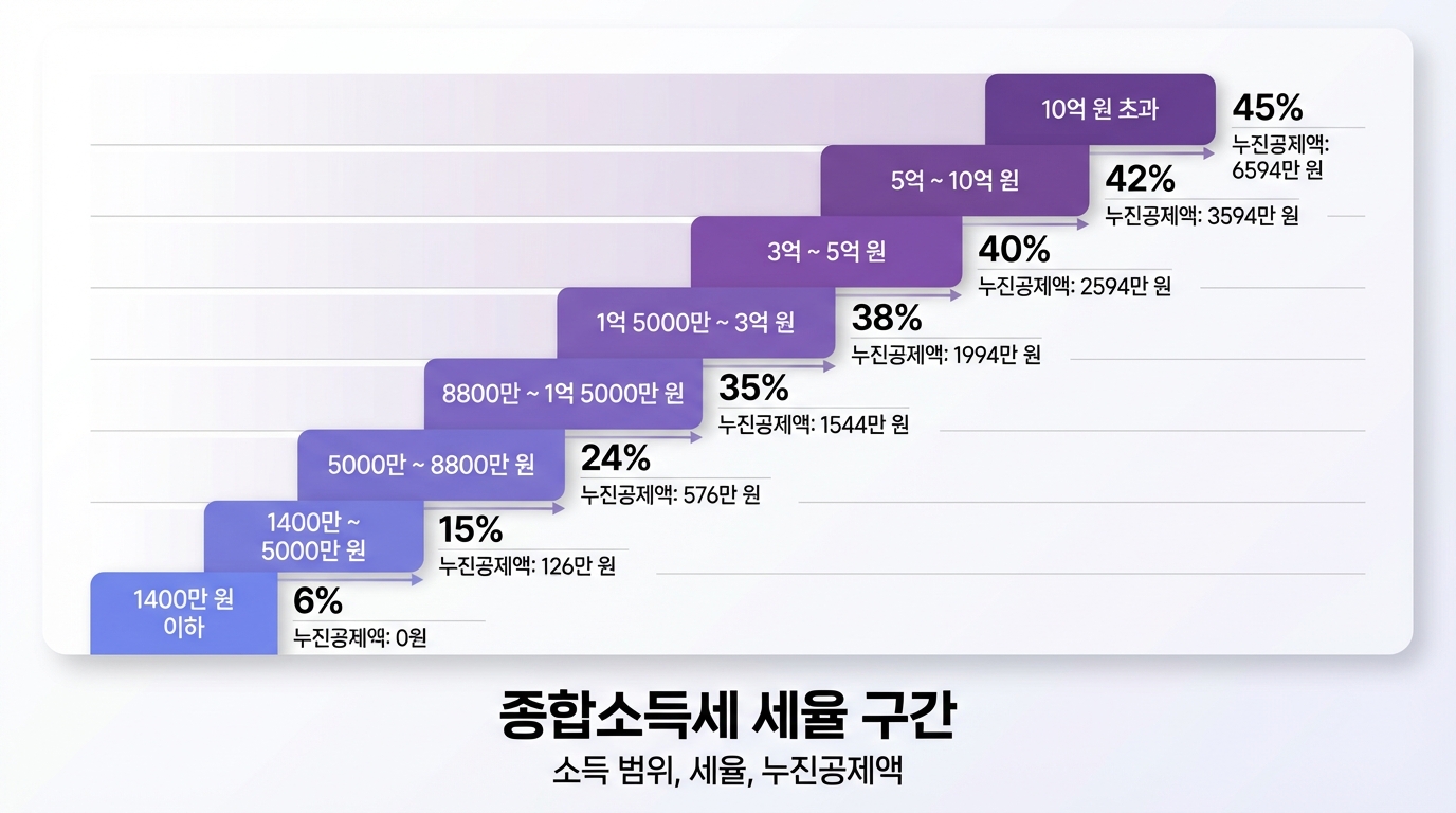 종합소득세는 과세표준 구간에 따라 6%~45%의 누진세율이 적용됩니다.