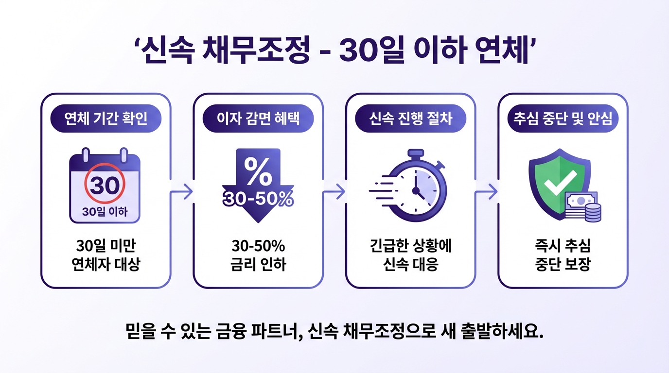신용회복위원회 채무조정은 연체 초기 단계에서 채무 부담을 줄이는 가장 효과적인 방법 중 하나입니다. 연체 기간에 따라 신속채무조정, 사전채무조정, 개인워크아웃 중 하나를 선택하게 되며, 각각 이자율 조정과 상환기간 연장, 원금 감면의 폭이 다릅니다.