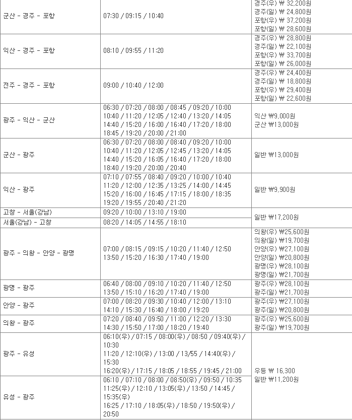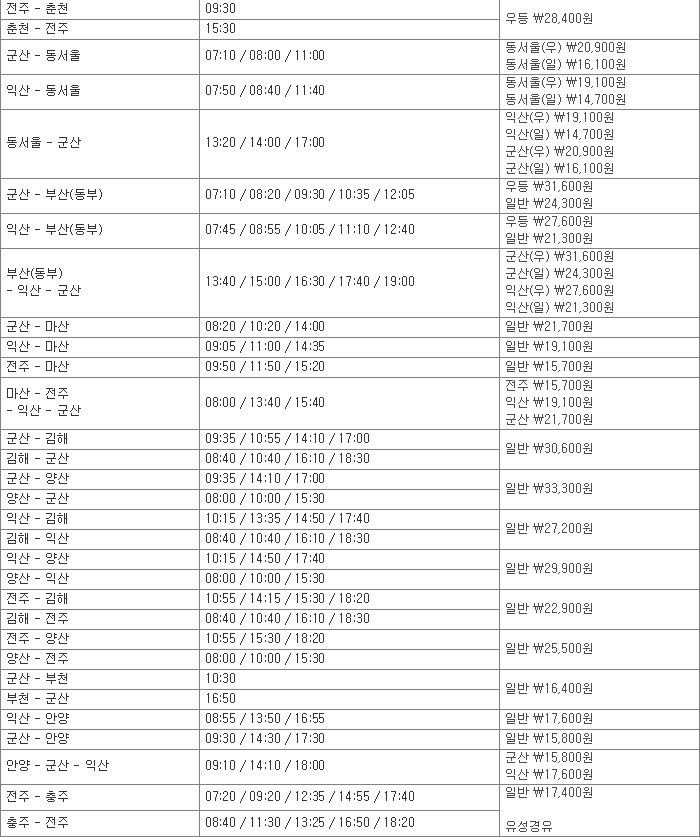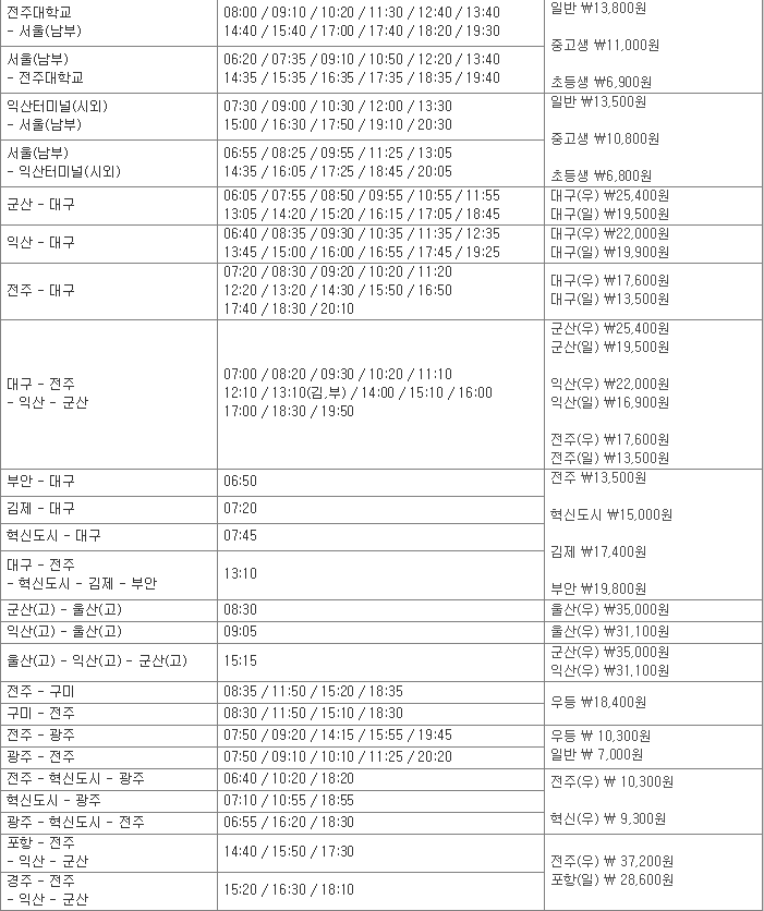 *전주 시외버스터미널 버스 시간표 및 요금 정보(온라인)