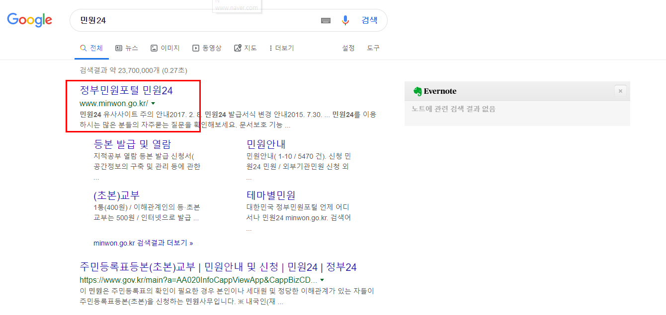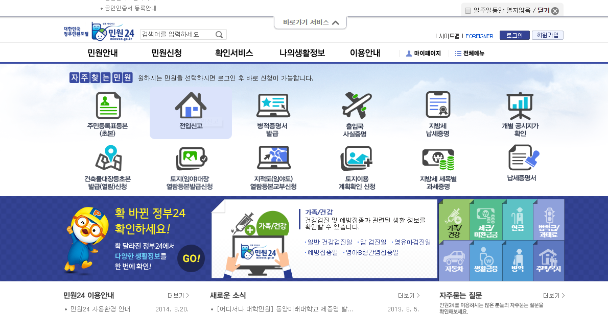 01. 구글 / 다음 / 네이버 등의 포털 사이트 검색창에 '민원 24'를 검색합니다. 민원 24 사이트의 전체 페이지 모습입니다.