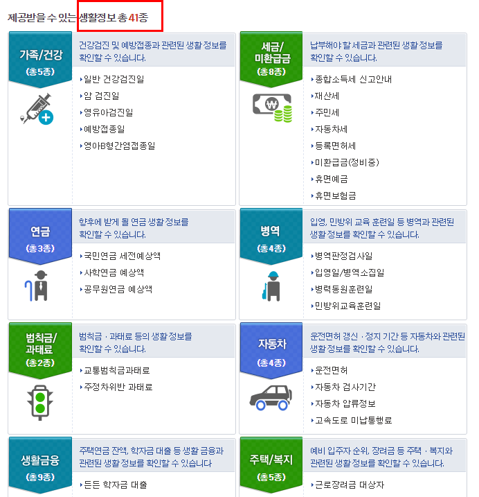 41종의 생활 정보를 제공받을 수 있습니다. 대한민국 국민으로써 제공받을 수 있는 정보가 41종이 있다는 사실은 처음 알게 되었습니다.