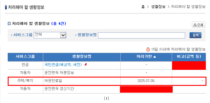 04. 로그인과 동시에 다양한 생활정보를 확인할 수 있는데요. 그중 주택/복지 탭에 여권만료일이 기재되어 있습니다.