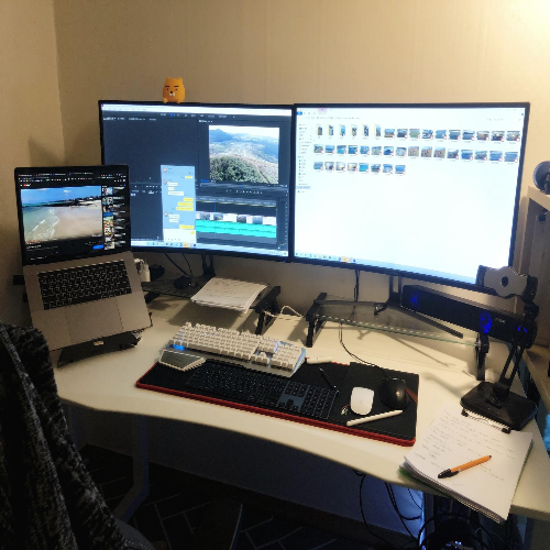 실제로 조립 완성 된 제닉스 <ARENA DESK WHITE 1500>입니다. 32인치 듀얼모니터와 맥북 프로 15인치 및 아이패드 프로 등 넉넉히 공간을 사용할 수 있습니다.