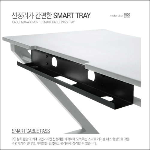 두번째 특징, 배선정리가 간편한 SMART TRAY 입니다. 모니터 파워 선, HDMI 선, 본체 파워 선, 스피커 선 등 PC 운용에 있어서 필요한 배선이 10개 이상은 되는 것 같습니다. 정리되지 않은 배선으로 인해 외관상 좋지 않았었는데요. 제닉스 아레나 게이밍 책상 뒷쪽에 스마트 트레이를 통해 배선 정리할 수 있는 공간이 제공됨으로써 깔끔한 선정리가 가능해졌습니다. 책상 뒷편의 사용하지 않는 공간을 효율적으로 사용한다는 것이 큰 장점 중에 장점이라고 생각합니다.