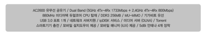 위의 이미지처럼 다양한 기능이 있는 와이파이 공유기입니다. Dual Band와 5GHz 1,733Mbps + 2.4GHz 800Mbps 지원이 크게 매력적인 포인트였습니다. 최대 WIFI 2600Mbps 동시 지원해주는 ipTIME A8004T 미친 속도죠.