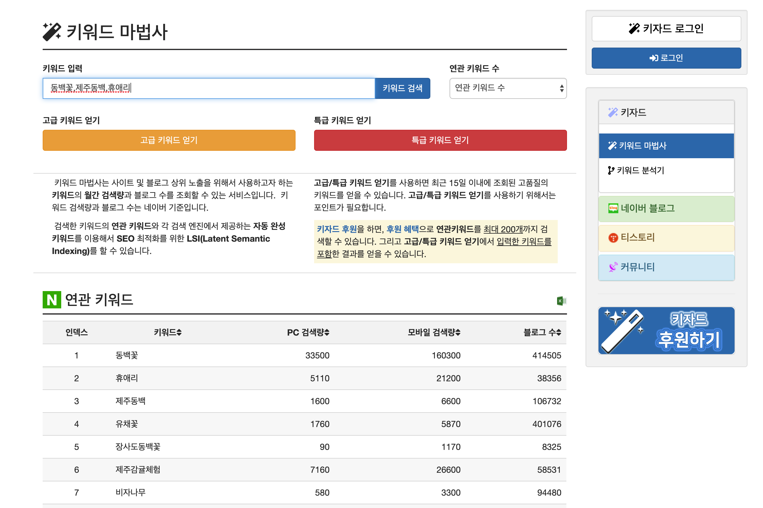 이곳 Keyzard.net 사이트는 키워드 분석뿐 아니라 네이버 블로그의 구글 검색 등록과 티스토리 백링크 등록 및 블로그 조회 등 다양한 기능이 담겨있어 이용하는 데 편리함이 있는 사이트입니다. 연관 키워들의 검색량 및 총 블로그 수를 확인 가능하며 5개 키워드를 동시에 조회 가능하다는 장점이 있습니다. 키자드 사이트는 후원제로 운영이 되고 있습니다. 기본적인 기능은 무료로 이용 가능하지만, 특급 키워드 조회 및 여러 기능은 후원 회원에 한정하여 이용 가능합니다.