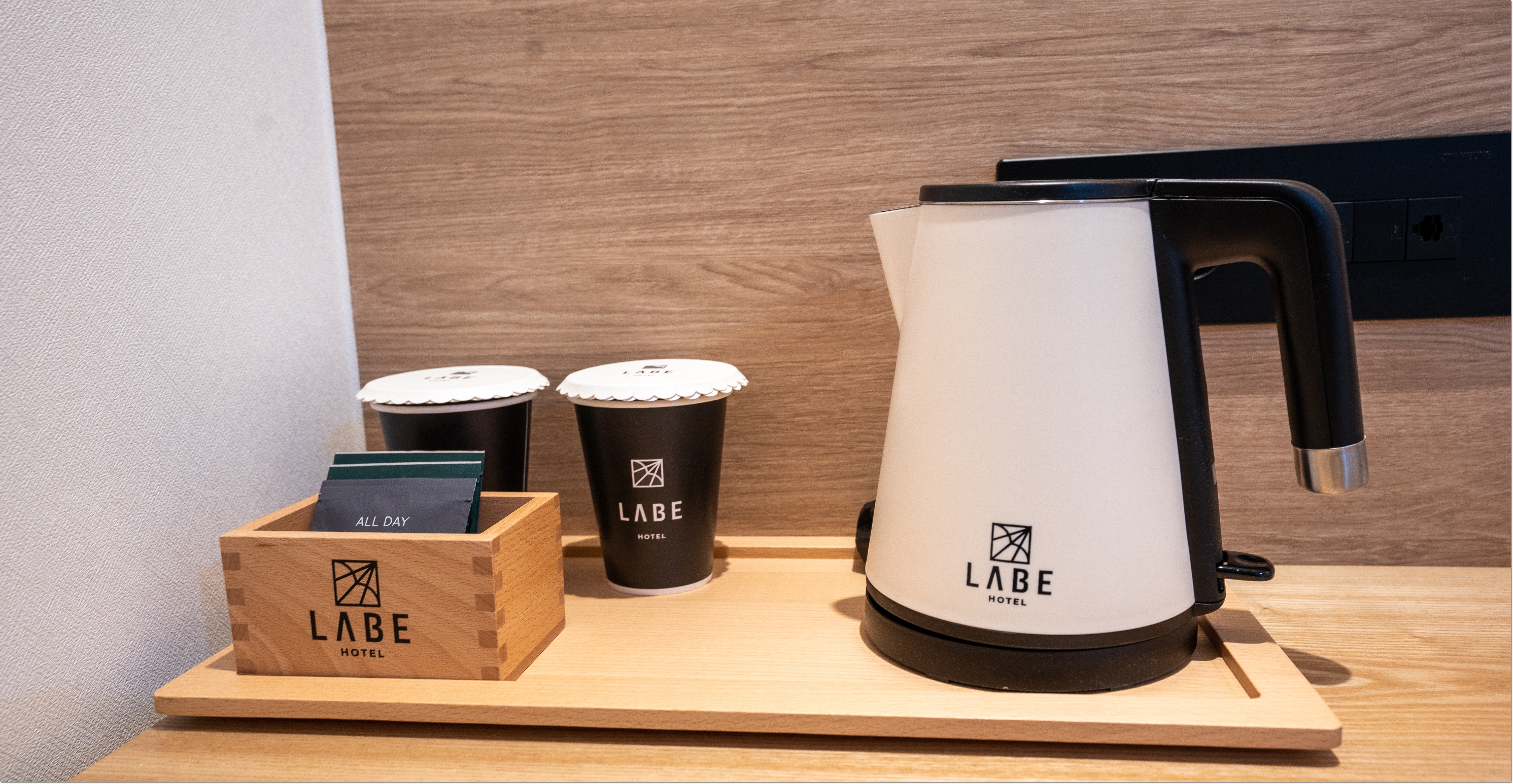로고가 박힌 티박스와 전기포트입니다. 티백 커피와 차가 준비되어 있어서 차 한잔의 여유를 즐겨보시는 것도 좋을 것 같습니다.