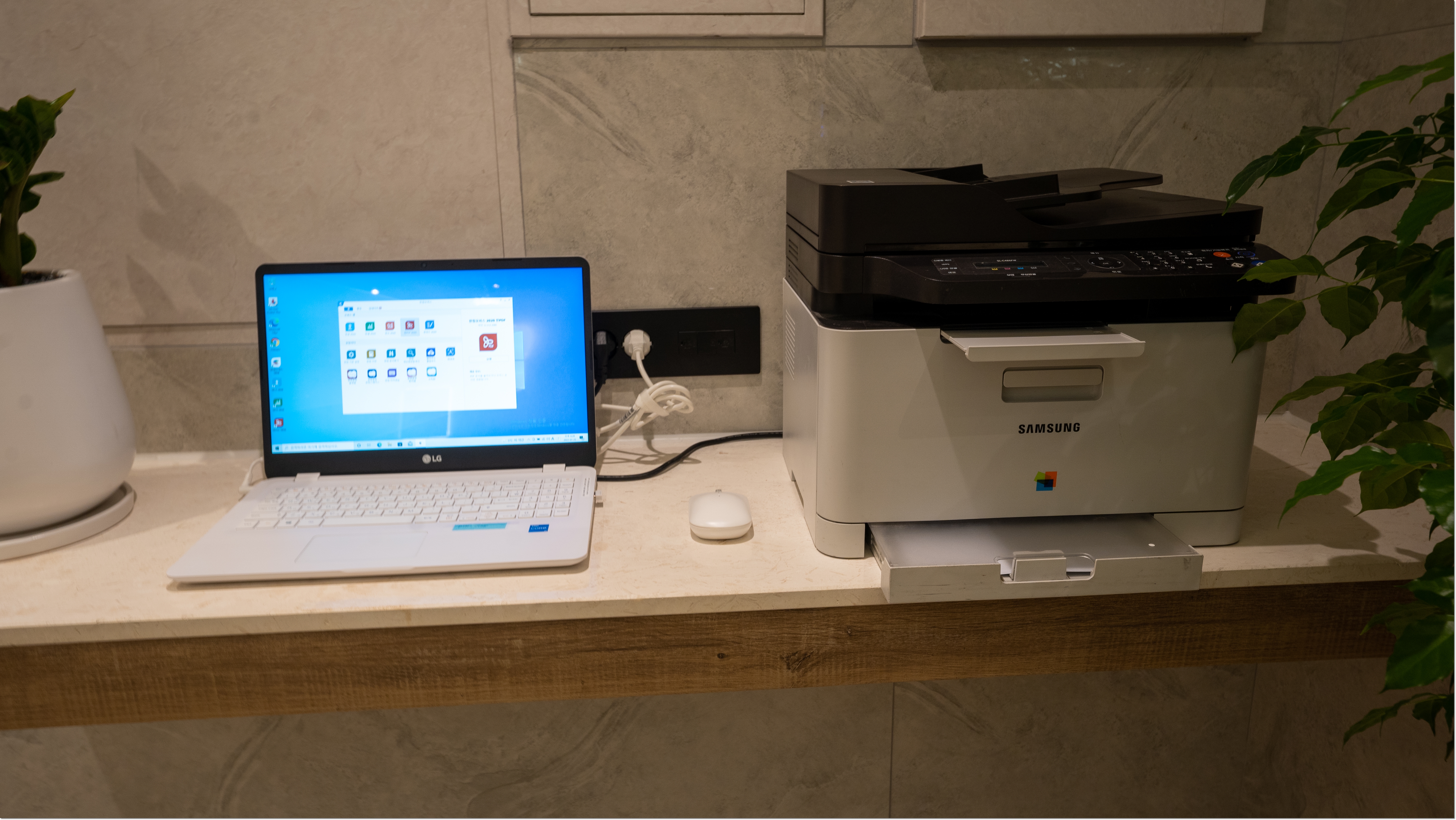 호텔 프론트에 노트북과 복합기가 준비되어 있습니다. 출장 오시는 분들이 종종 프린트 할 일이 생기곤 하는데요! 전주호텔 라베에서는 마음껏 이용이 가능하다고 합니다.