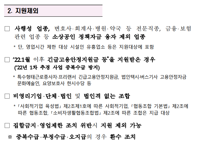 모든 소상공인들이 받으면 좋겠지만, 사행성 업종 또는 전문 업종의 경우 제외가 되며, 22년 1월 이후 긴급 고용 안정 지원금을 받은 경우 역시 제외된다고 합니다. 비영리 기관, 단체 역시 불가하고, 집합금지 영업제한 조치를 위반했던 영업장 역시 지원받을 수 없습니다.