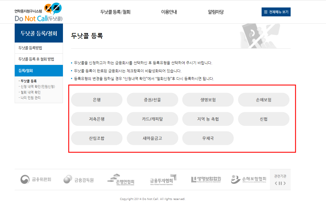 휴대전화 본인인증 절차가 마무리되면 스팸전화, 문자를 차단하고자 하는 금융권의 버튼을 눌러 각 금융사의 영업 광고 연락을 차단하실 수 있습니다.