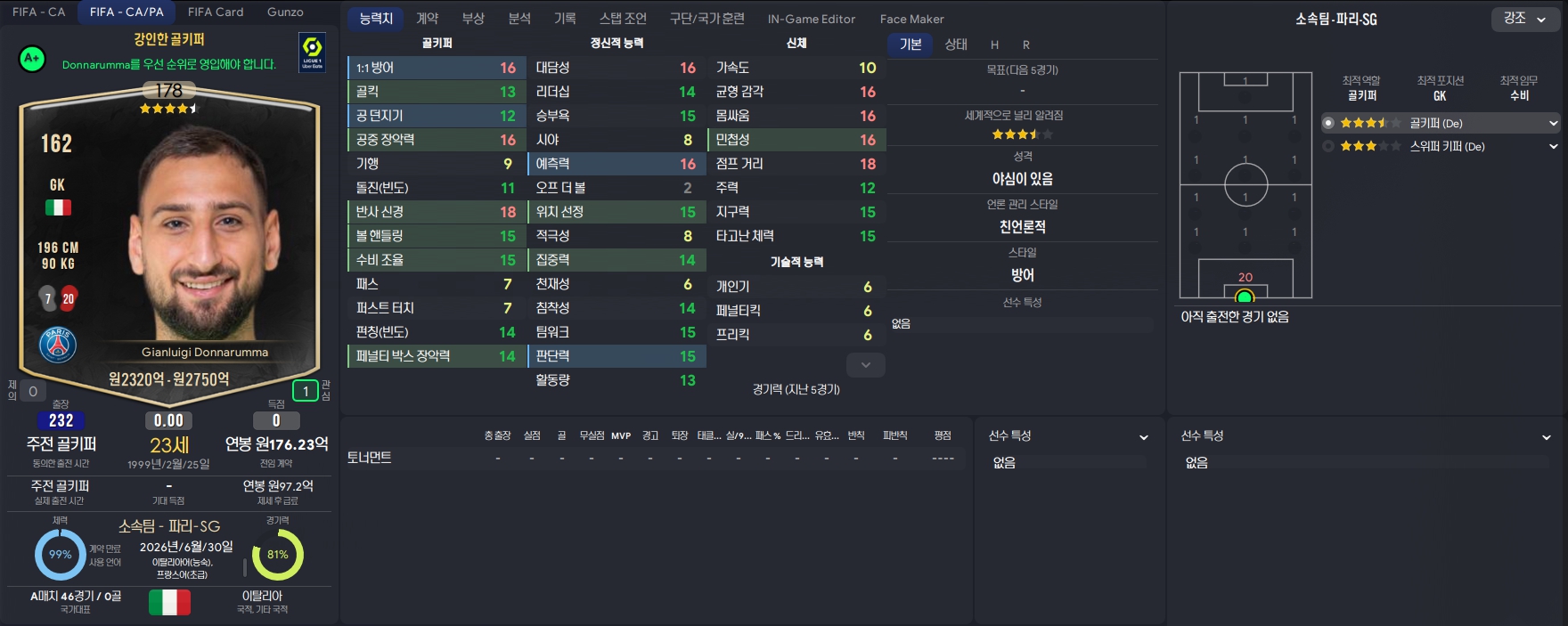 이 선수는 1999년 2월 25일 이탈리아 출생의 선수입니다. 현 소속은 파리 생제르망(PSG)입니다. 잔루이지 돈나룸마 골키퍼는 FM 시리즈에서도 매번 본좌 골키퍼, FM 유망주 골키퍼로 선정될 만큼 뛰어난 능력치를 가지고 있는 선수입니다.