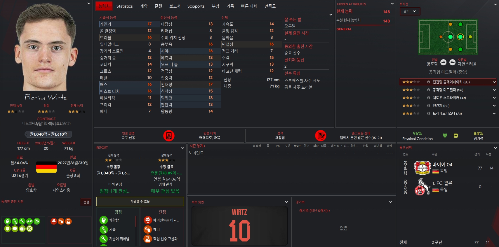 Florian Wirtz 선수는 제가 FM할 때마다 정말 좋아하는 선수입니다. 레버쿠젠 소속으로 현재 주전으로 활약하고 있는 선수입니다. 개인기와 패스 능력치가 뛰어나 득점 상황을 잘 만들어주는 선수입니다. 쉽게 공을 뺏기지 않는 선수로 기억하고 있습니다.