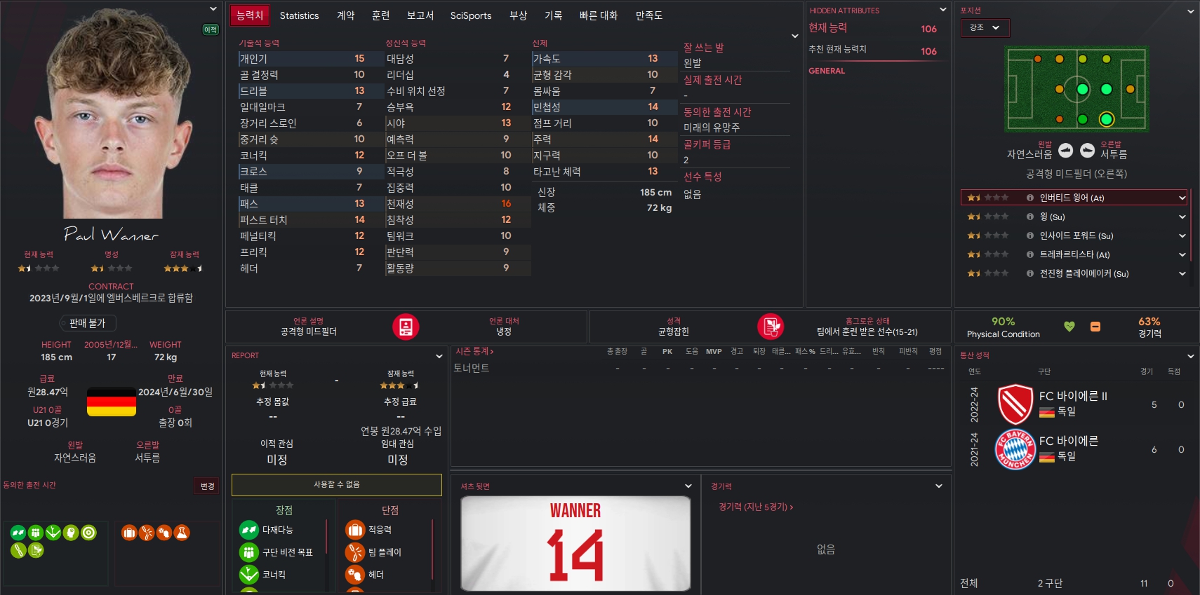 Paul Wanner 선수 역시 바이에른 뮌헨 u-19에 소속된 유망주입니다. FM2023에서도 사용해본 적 있는데요. 중미와 공미 그리고 오른쪽 윙까지 어디에 놓든 밥값 이상하는 선수로 기억하고 있습니다. 이번 FM2024 유망주에서도 높은 포텐 점수를 기록하고 있습니다. 이 선수는 훈련만 잘 시키면 거의 모든 포지션을 소화할 수 있을 것으로 보입니다.
