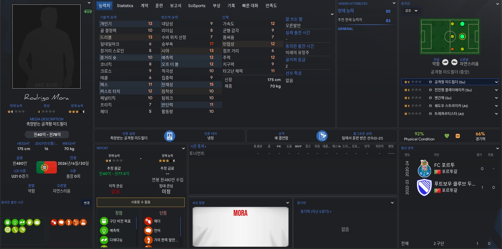 Rodrigo Mora 선수는 FC 포르투 소속의 선수입니다. 승부욕이 특히 강하며 중앙 공격형 미드필더 뿐 아니라 왼쪽 윙도 자연스럽게 소화할 수 있는 선수입니다.