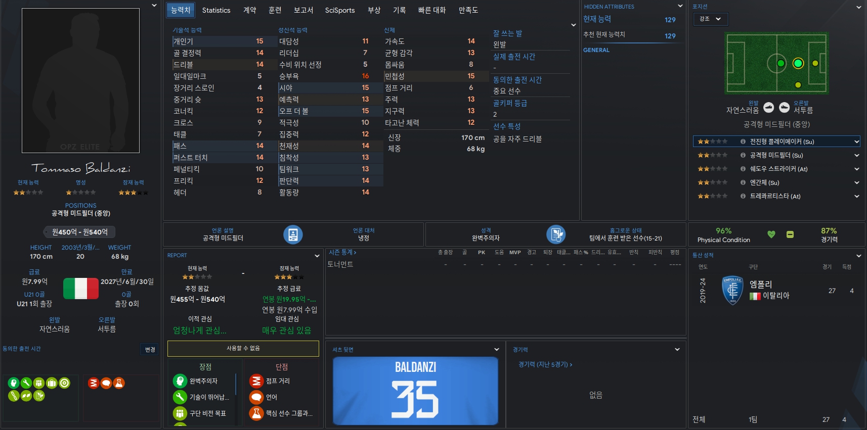 Tommaso Baldanzi 선수는 이탈리아 리그의 엠폴리 소속의 선수입니다. 전체적인 능력치가 준수하여 다방면에서 팀에 도움이 클 선수로 예상됩니다. 왼발을 주로 사용하는 선수이며 중앙 미드필더 역시 잘 소화할 수 있는 선수입니다.