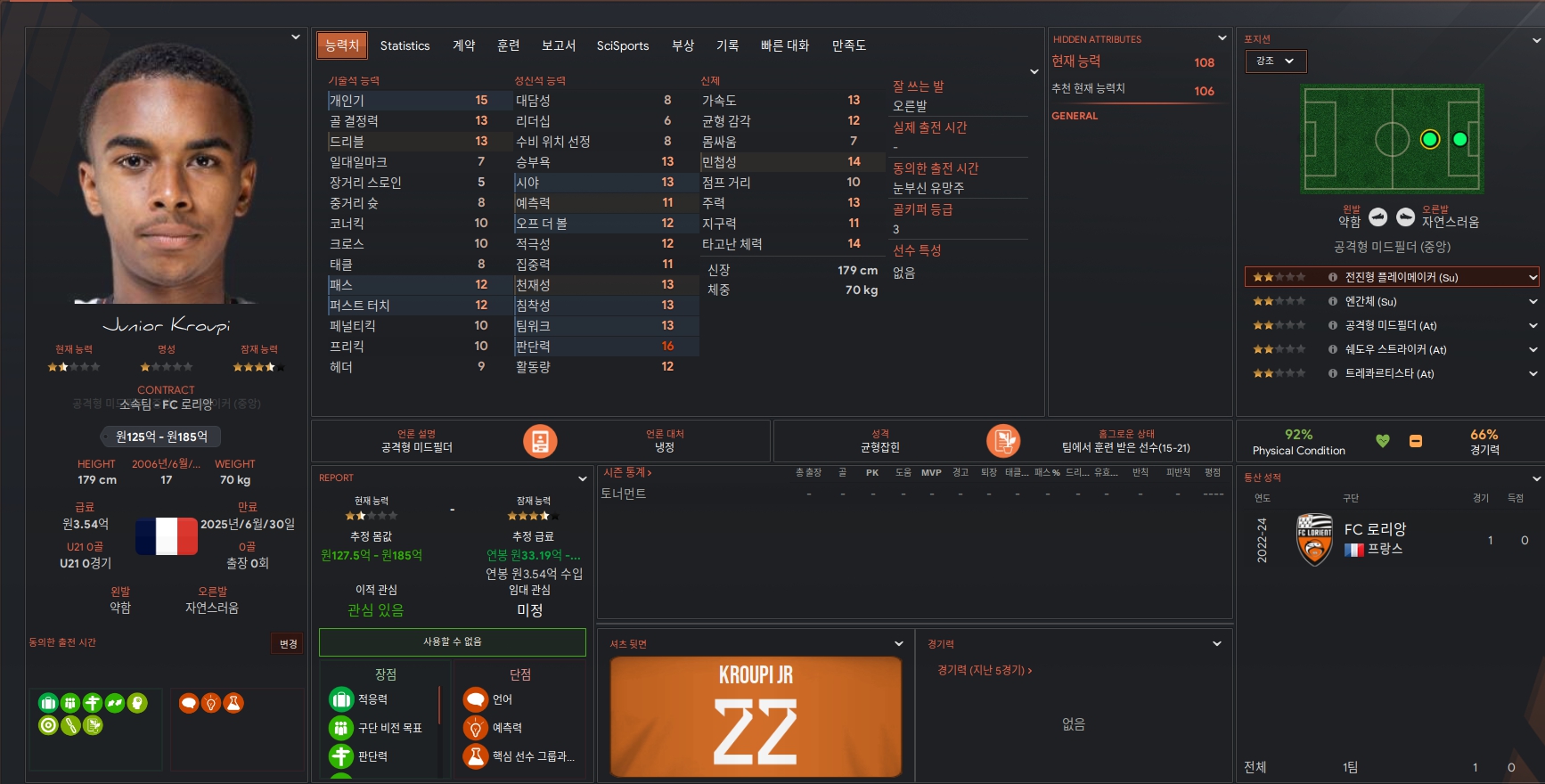 Junior Kroupi 선수는 프랑스리그 FC로리앙 소속의 선수입니다. 오른발을 주로 사용하며 중앙 공격형 미드필더와 스트라이커 포지션에서 자연스럽게 활약하는 것으로 조사되었습니다. 현재 예상 몸값은 125억 ~ 185억 사이라 어렵지 않게 구매 가능할 것으로 보입니다.
