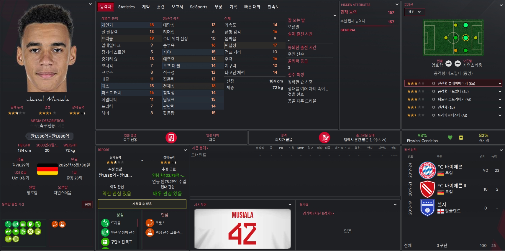 Jamal Musiala 선수는 김민재 선수가 활약하고 있는 '바이에른 뮌헨'의 특급 유망주입니다. 20세의 어린 나이에 개인 능력치가 매우 높은 선수입니다. 중앙 공격형 미드필더 뿐 아니라 왼쪽 윙어 역할도 자연스럽게 할 수 있으며 오른쪽 윙어 및 중앙 미드필더까지 소화 가능한 다재다능한 선수입니다. FM2024 포텐도 94점으로 중앙 공격형 미드필더에서 최고 높은 점수를 보여주고 있고, 고정 포텐이라 믿고 쓸 수 있는 선수입니다.