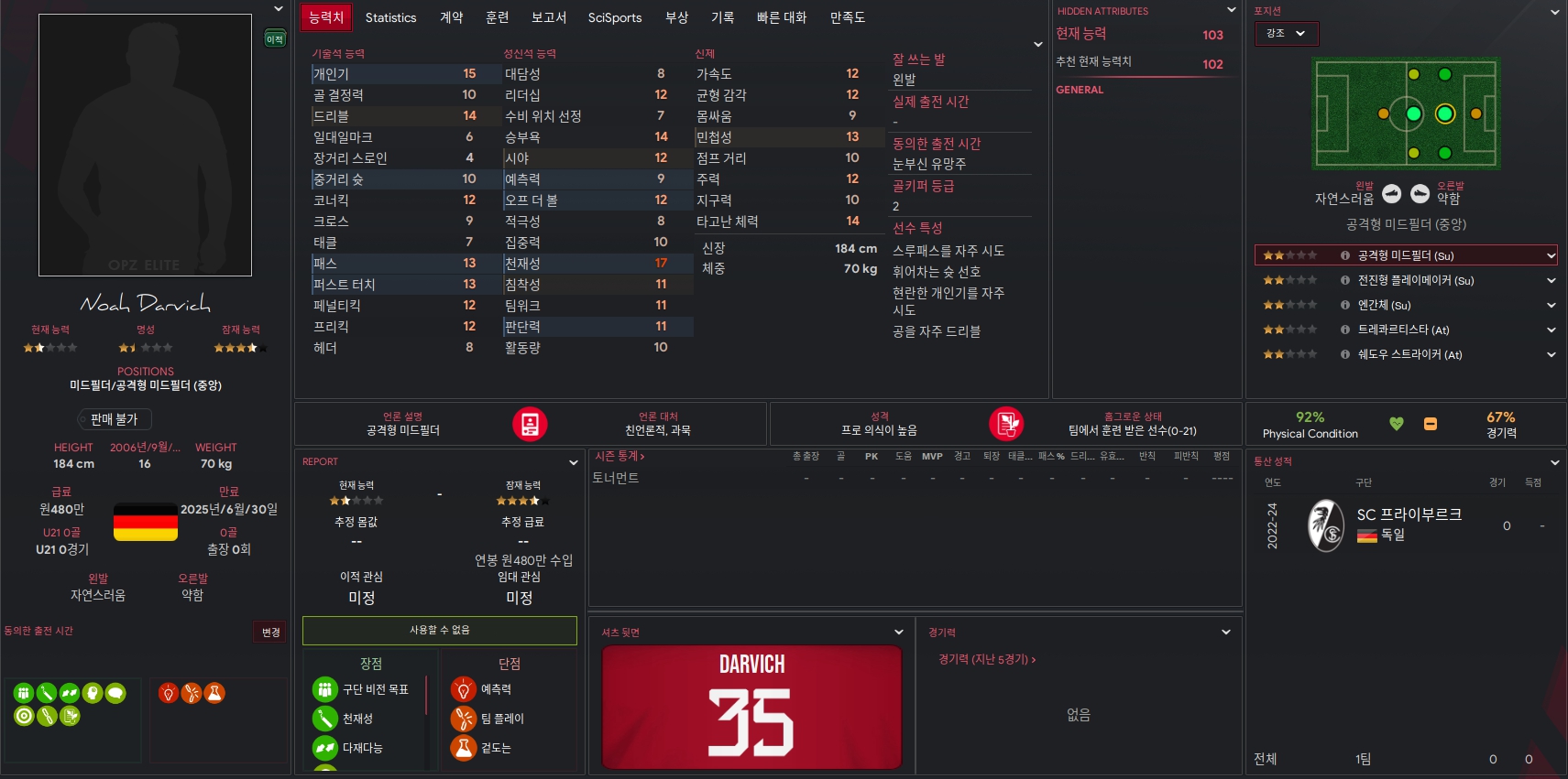 Noah Darvich 선수는 뷔르템베르크 소속의 선수입니다. 올 시즌 바르셀로나로 합류하게 되는 특급 유망주 중 한명인데요. 16세의 나이에도 불구하고 전체적인 능력치가 뛰어난 선수입니다. 잠재능력 역시 별 4개로 조사되었습니다. 천재성이 특히 뛰어나 창의력 있는 플레이를 보여줄 것으로 기대됩니다.