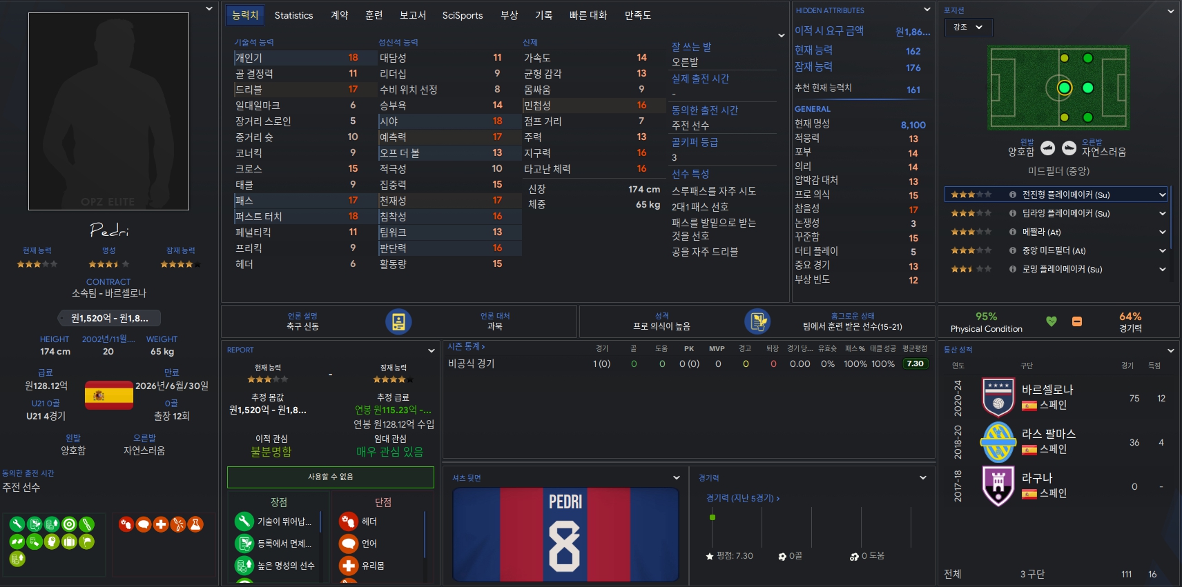 PEDRI 선수 역시 FM 시리즈에서 유망주로 소개되는 것 같습니다. 이번 FM2024 유망주 추천에서도 어김없이 이름이 올라와있습니다. 중앙 미드필더로써 가지고 있는 역량을 가진 선수로 기본적인 체력을 비롯해 시야, 예측력, 판단력 등이 뛰어난 선수입니다. 거기에 개인기와 드리블까지 좋아 중앙 미드필더로써는 최고의 잠재력을 가진 선수라고 생각합니다.