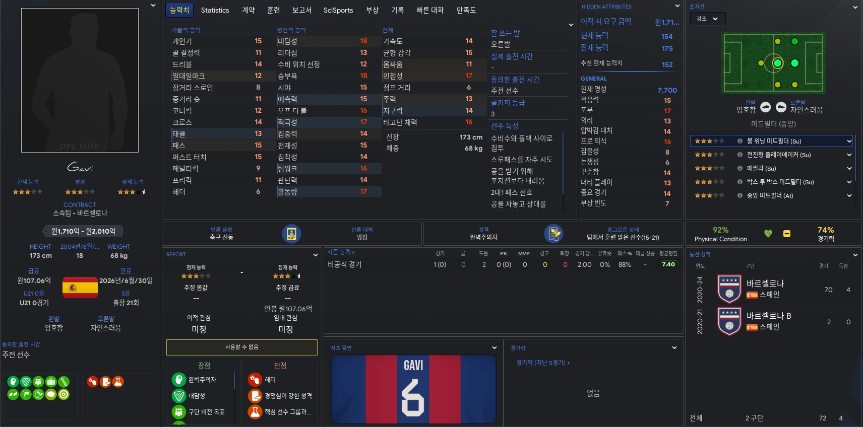 GAVI 선수 역시 유망주로써 최고의 선택을 받는 선수입니다. 바르셀로나를 대표하는 선수죠. PEDRI와 비슷한 스탯을 가지고 있는데요. 잠재능력이 175로 높은 점수를 기록하고 있습니다. 체력뿐 아니라 활동량이 많은 선수인데요. 특히 어시스트를 많이 해주는 선수라 팀에 활력을 높여주는 선수입니다.