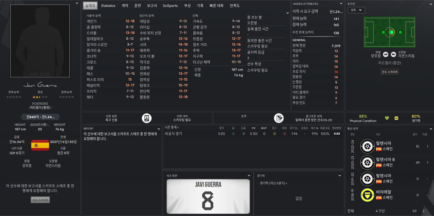 JAVI GUERRA 선수는 생소한 선수인데요. 이번작에서 고정 포텐으로 선정된 선수라 여러분들께 소개해드립니다. 현재 능력치도 141로 높은데요. 잠재능력은 165로 기록되어있습니다.