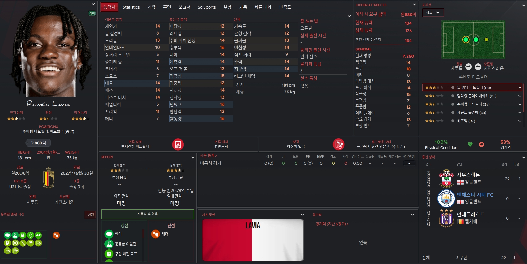FM2023에서도 멋진 활약을 보여준 유망주 Roméo Lavia 입니다. 사우스햄튼에서 활약하다가 첼시로 이적 예정인 선수인데요. 현재 능력치 134에 잠재 능력은 176을 기록하고 있는 선수입니다. 앞으로 첼시에서 보여줄 Roméo Lavia 선수의 활약이 기대됩니다.