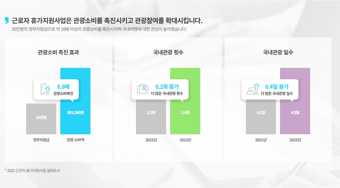 직장인들에게 있어 연차, 휴가는 생각만해도 설레는 존재입니다. 물가도 많이 오르고 여유가 없는 현대사회에 근로자 휴가지원사업으로 조금이나마 부담을 나눠 나에게 주는 힐링 선물로 국내 여행을 떠나는 건 어떠실까요?