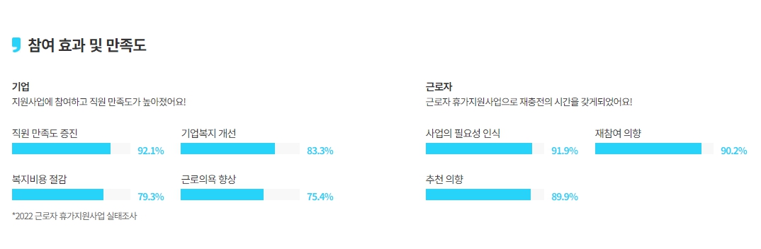 근로자 휴가비 지원사업에 참여하는 기업에도 큰 혜택이 있습니다. 근로자 휴가비 지원사업 참여증서 발급, 정부 인증 가점 부여, 실적 인정, 우수 참여기업 혜택 등을 받을 수 있습니다.
