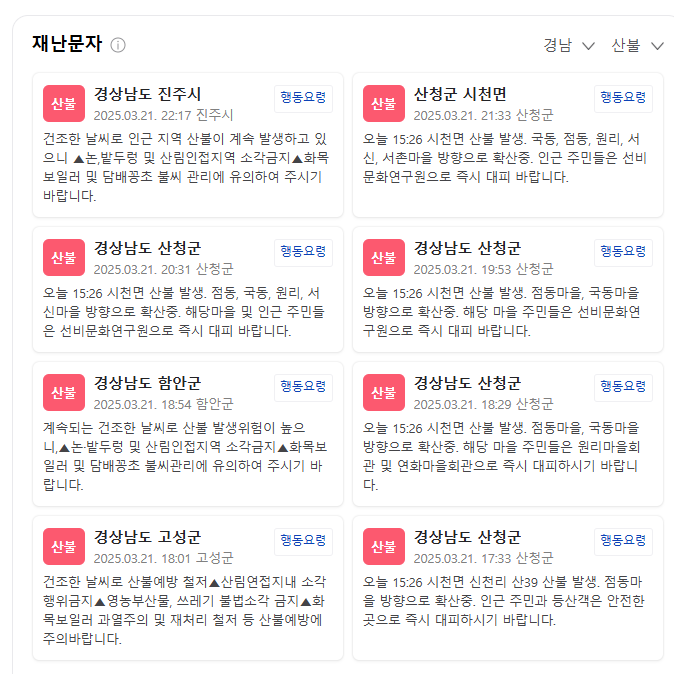 경남 산청과 경북 의성의 산불 현황 및 대응 방안안녕하세요. 최근 경남 산청군과 경북 의성에서 발생한 대형 산불 소식을 들으셨나요? 이번 산불은 많은 인력과 장비가 투입되었음에도 불구하